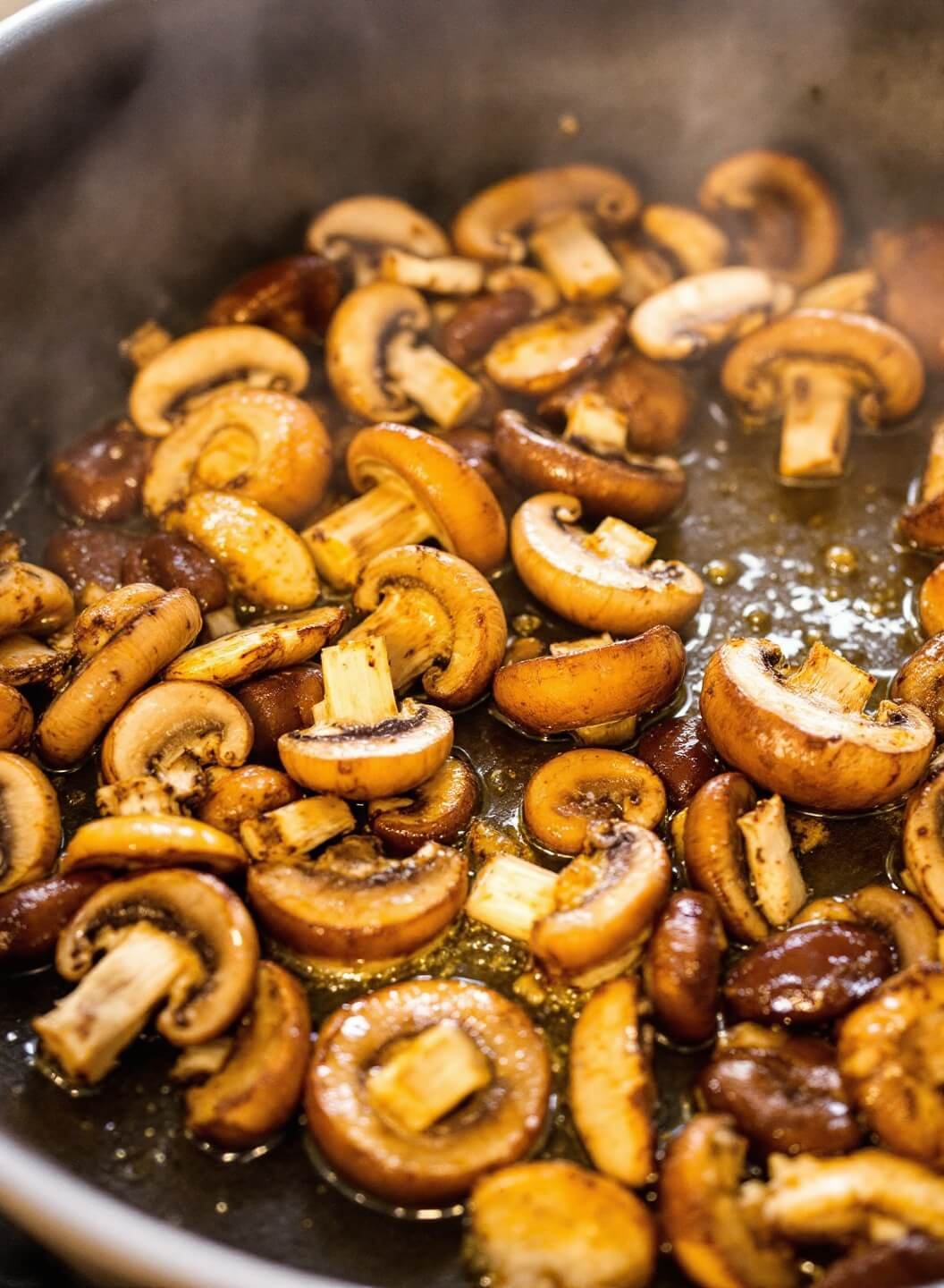 - Prepare mushrooms: Heat 1 tablespoon each of oil and butter in your main pan over medium-high heat. Cook mushrooms until golden brown (5-6 minutes). Remove and set aside.