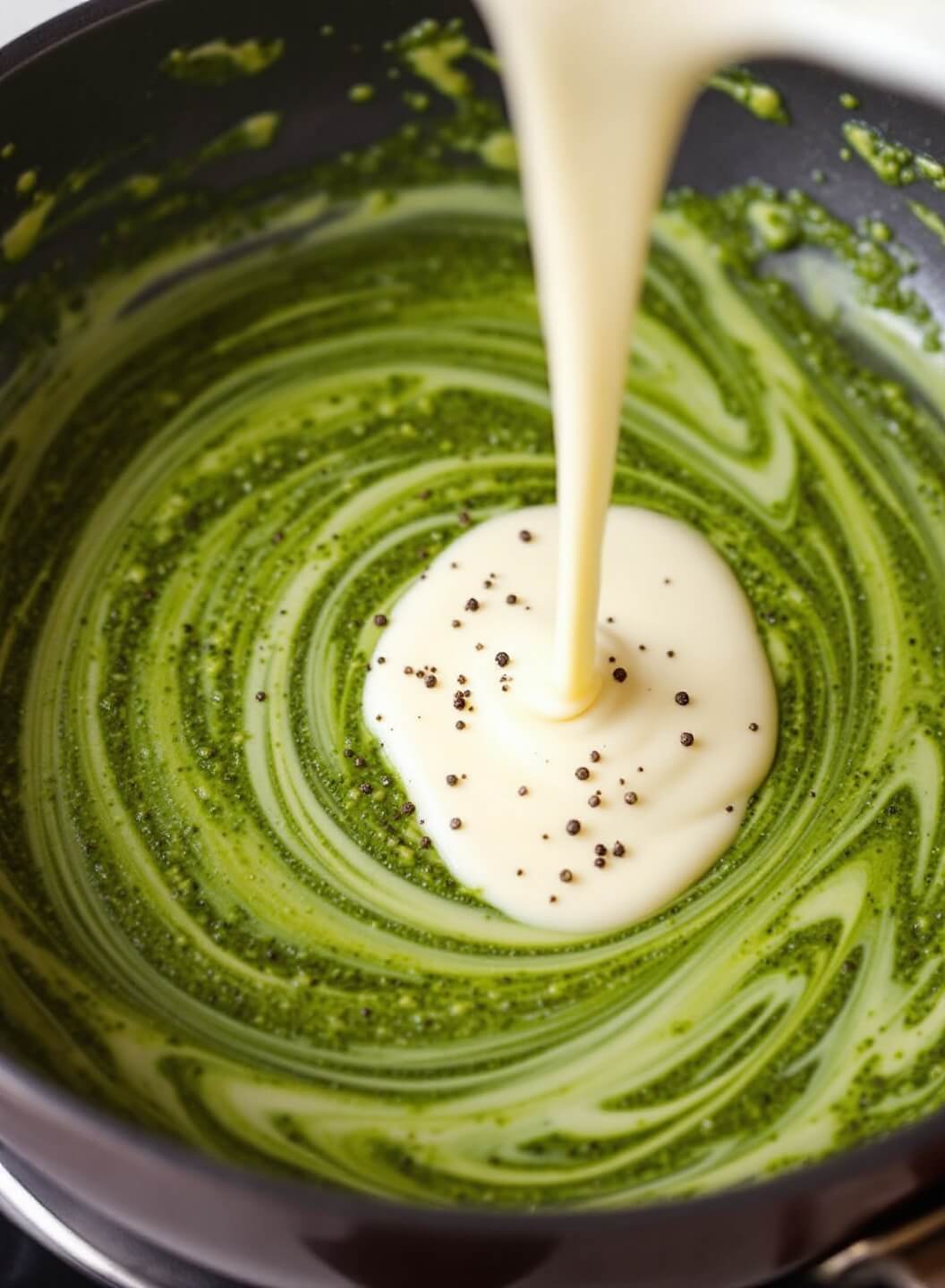- Pour in cream and pesto, simmer on low heat (2 minutes)