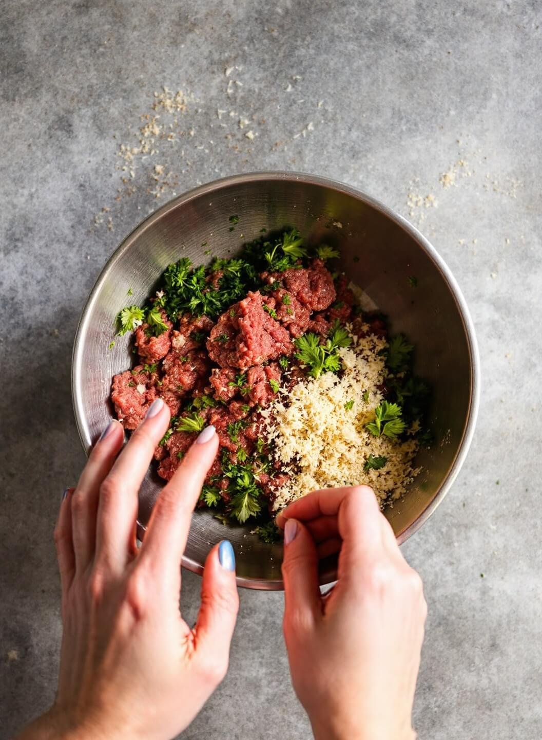 - Combine all meatball ingredients in a large bowl. Mix gently with hands until just combined – don’t overwork.