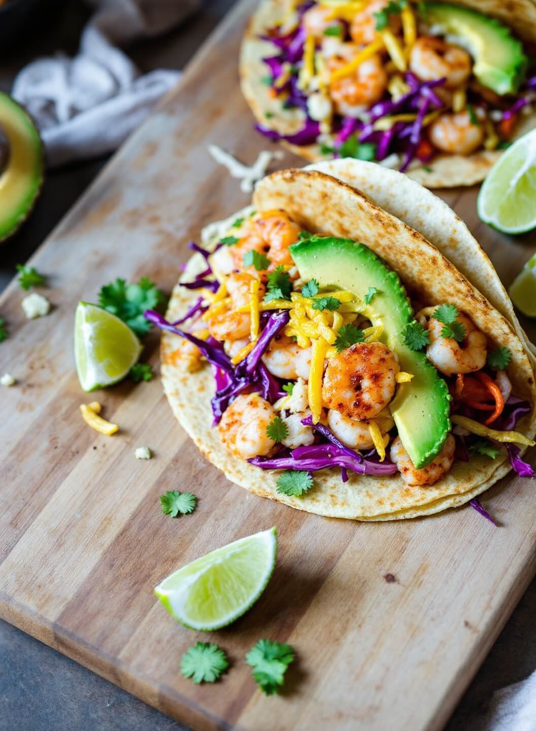 Layer: tortilla, slaw, shrimp, avocado, cheese, extra cilantro. Serve with lime wedges.