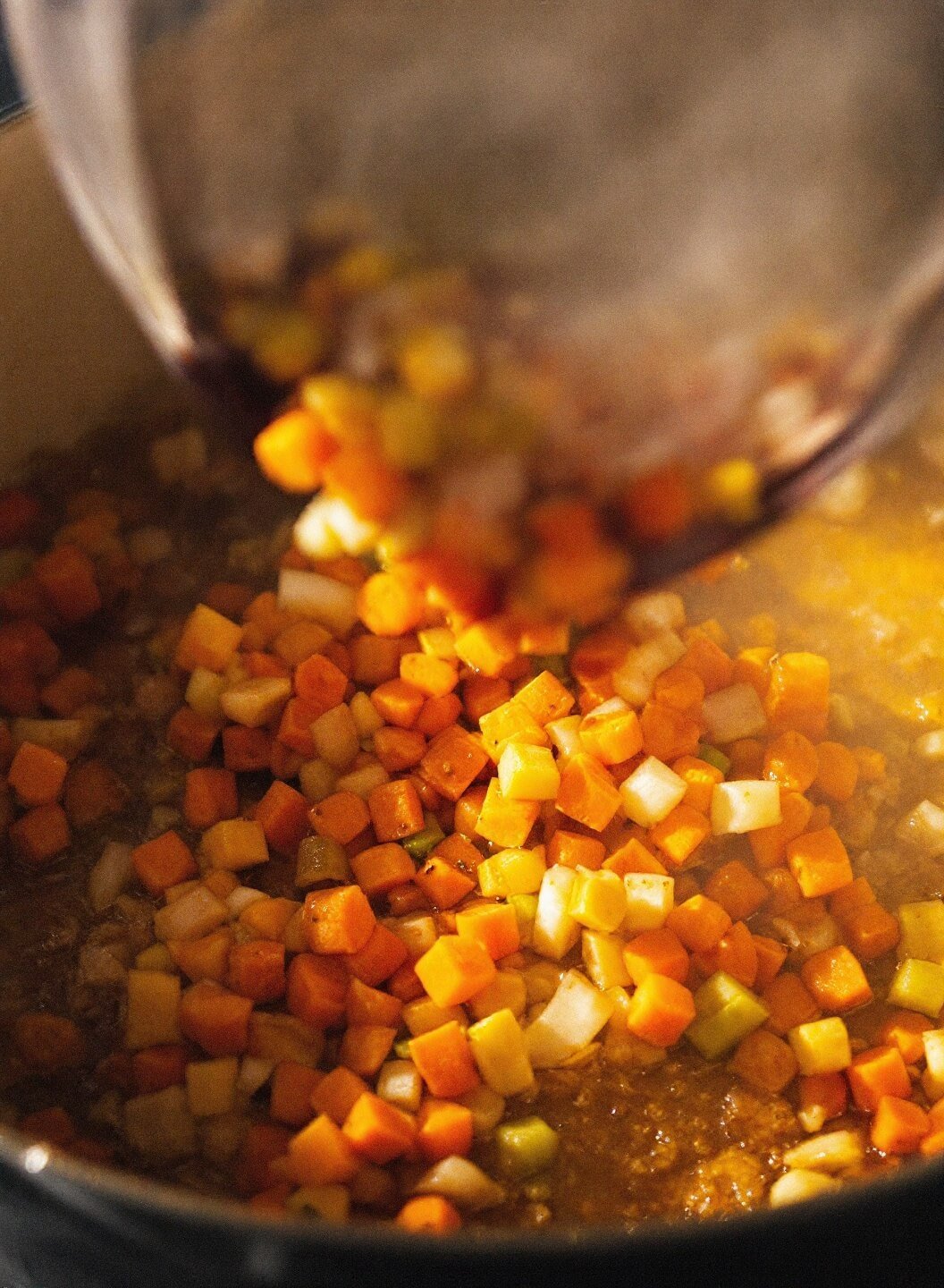 4. Reduce heat to medium. Add onions, carrots, and celery. Cook until softened (8-10 minutes).