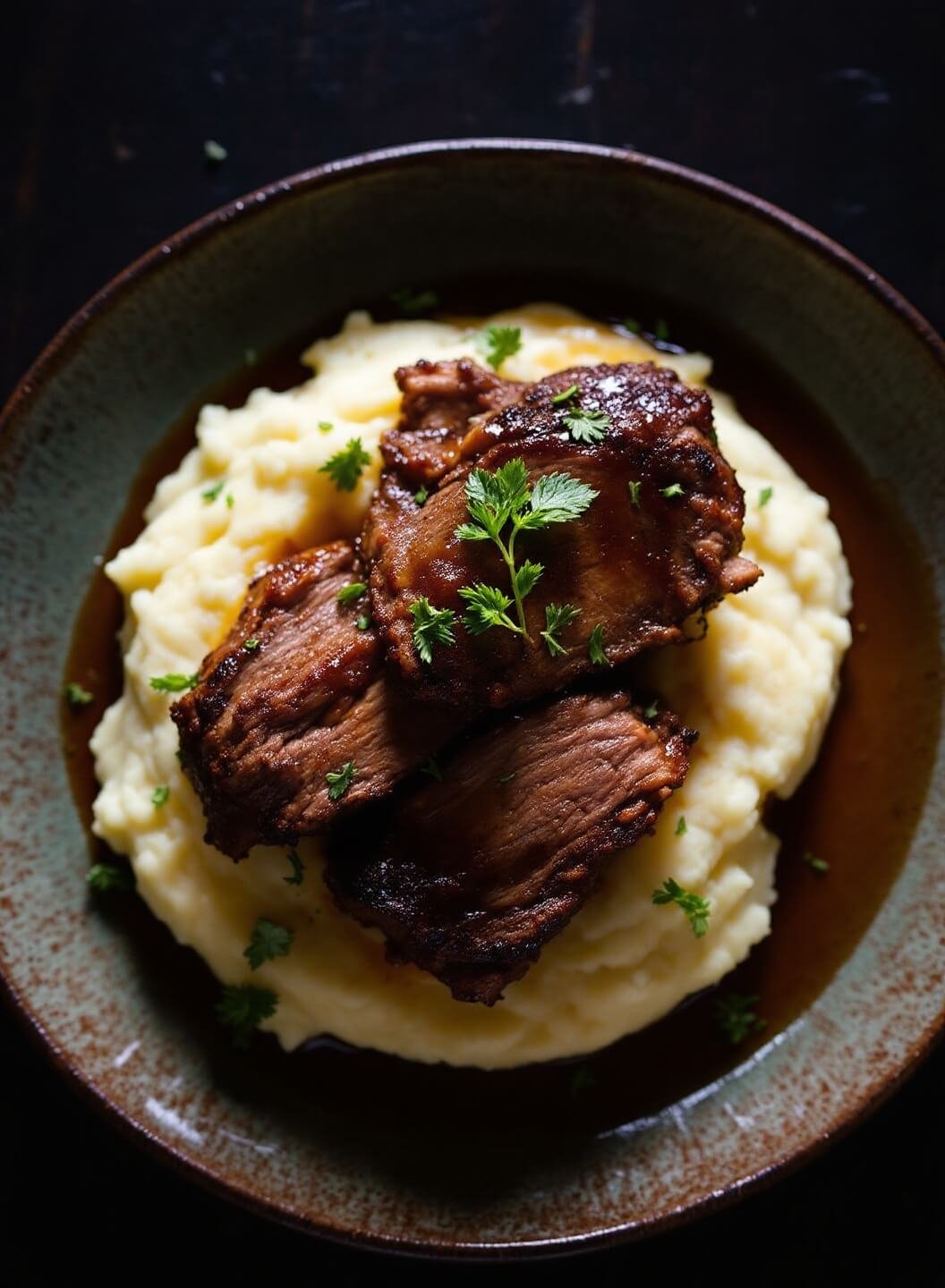 "Braised beef short ribs with red wine sauce on mashed potatoes, garnished with thyme and rosemary, served on a black ceramic plate"