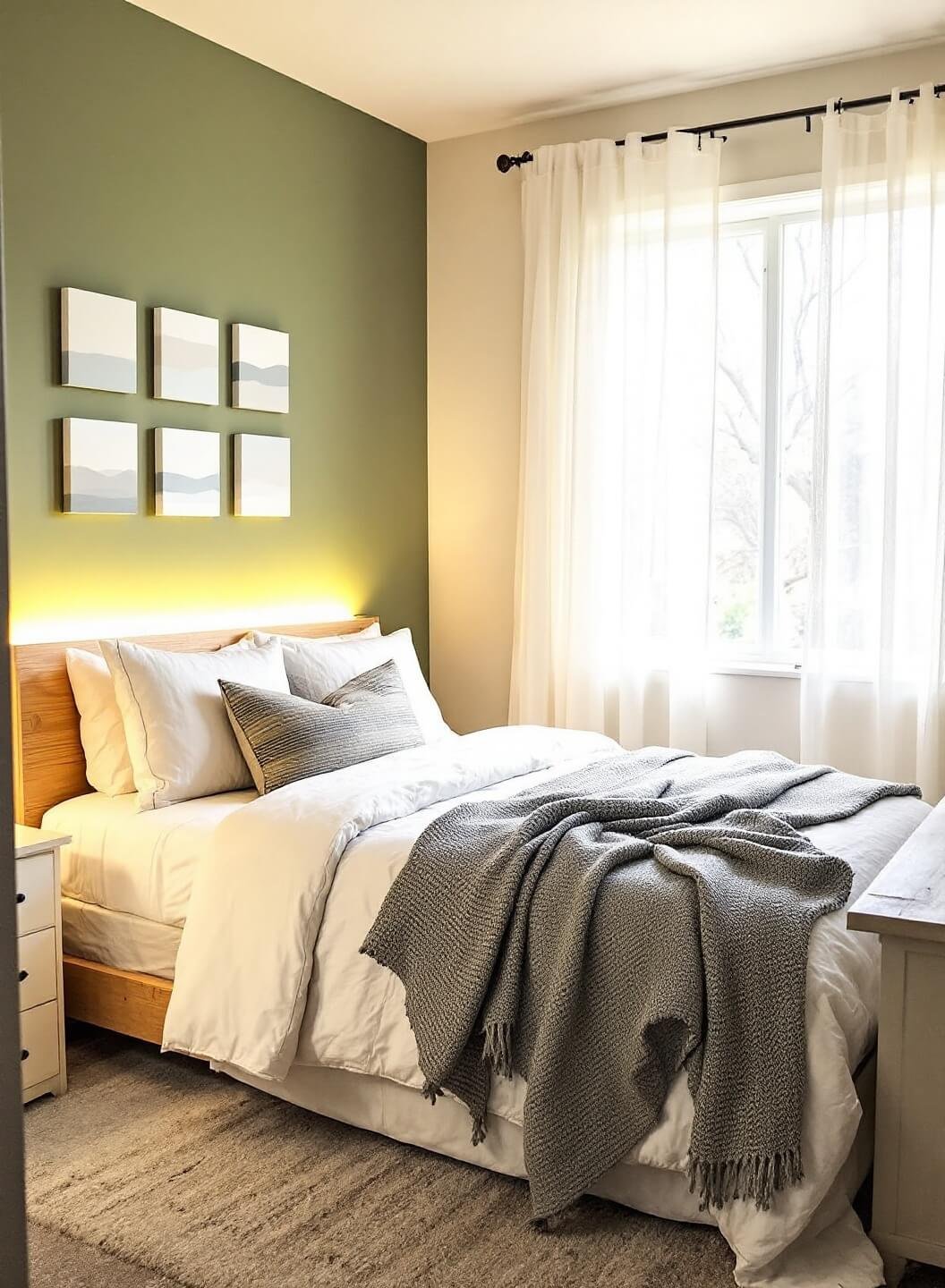 "Sunlit guest bedroom with sage green accent wall, vintage white dresser, and minimalist decor during golden hour"
