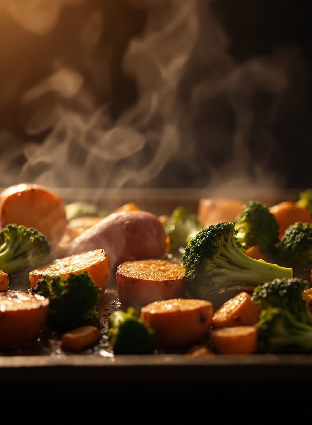 - Toss sweet potatoes and broccoli with olive oil, salt, and pepper. Place on baking sheet and roast for 25-30 minutes until golden.